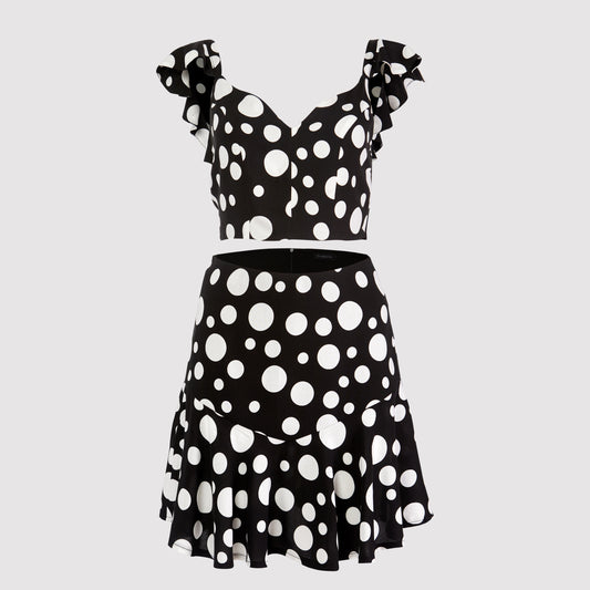 Anny body hugging crop frill strapped top, black-white dot printed