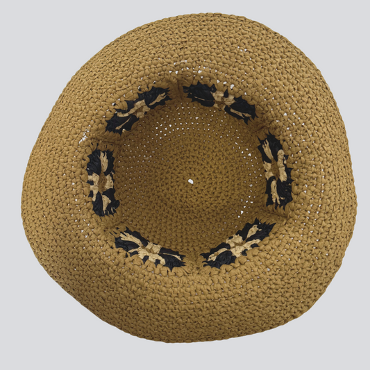 Amos hat hand-knitted raffia beach hat with 3 color crochet flower design , neutral color-black-off white